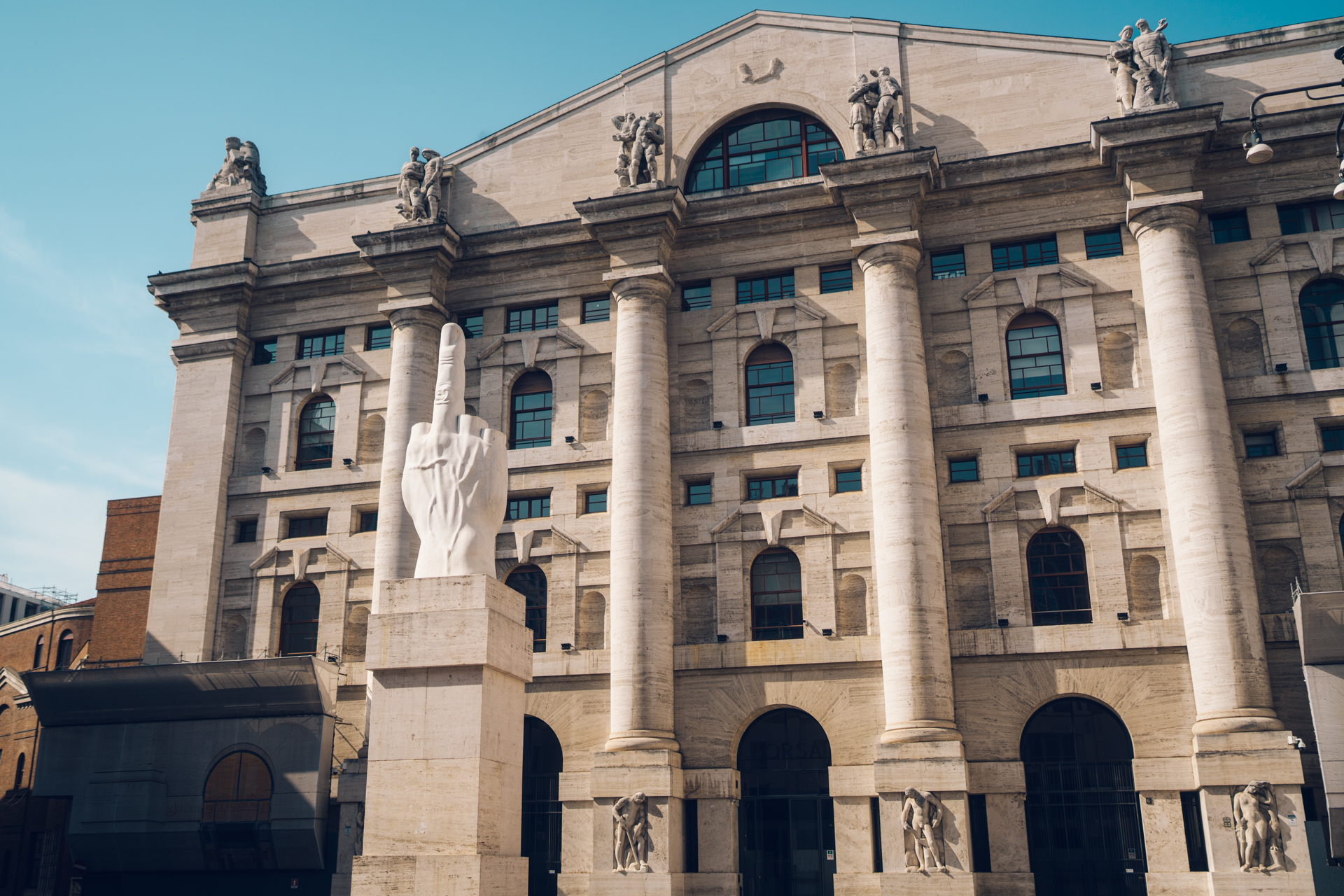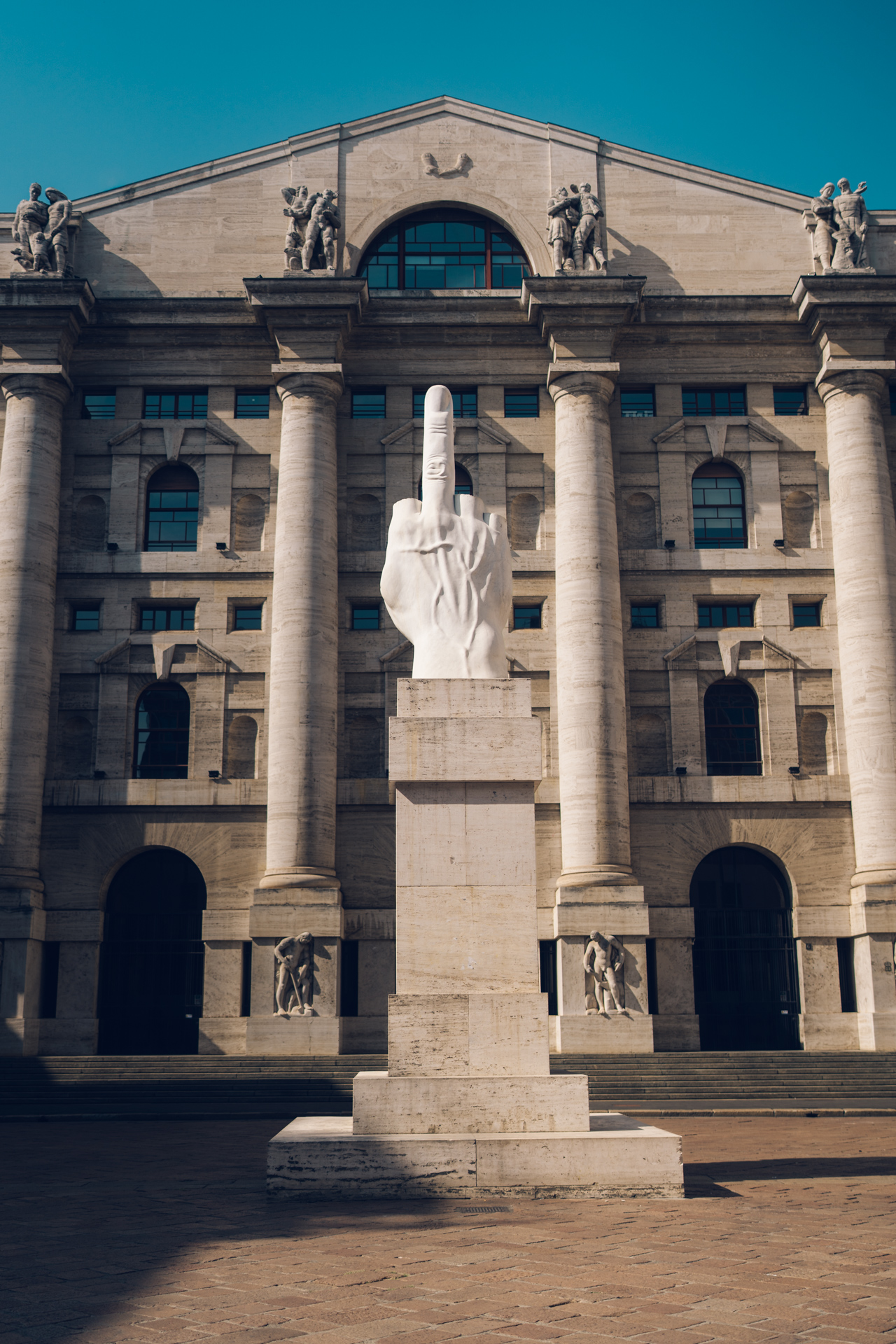 We came upon the Il Dito sculpture quite by accident, hidden away in Piazza degli Affari in front of the Milan stock exchange. Nobody knows exactly what it means. Its creator, Maurizio Cattelan, never explained it, but it is widely believed to have been a protest against various institutions after the 2008 financial crisis.